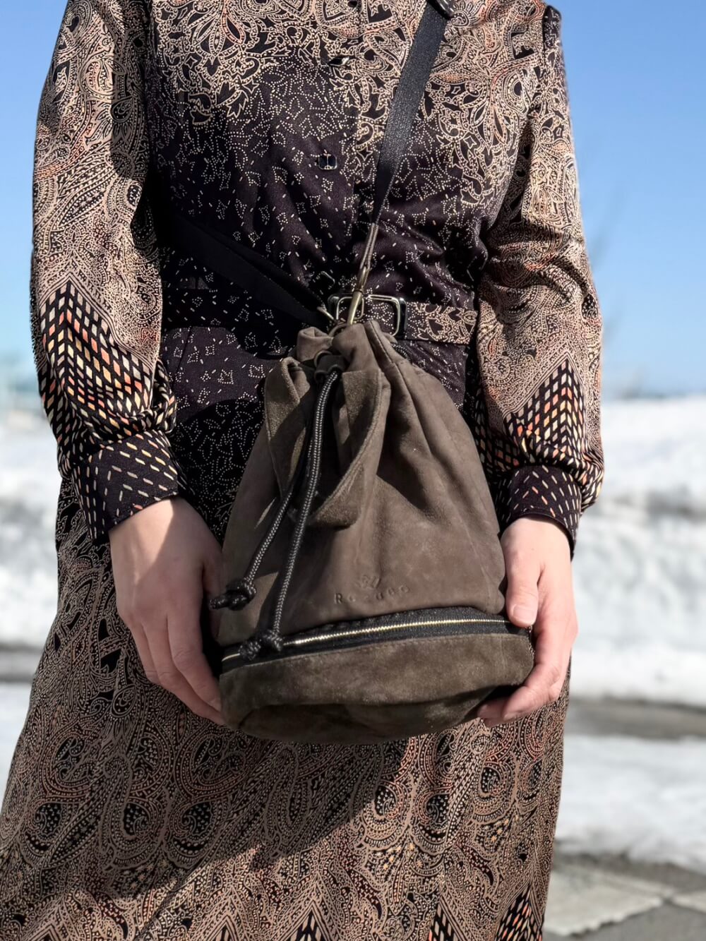 天然エゾ鹿革のドロップバッグは、